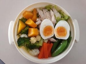 ไข่ต้มเป็นแหล่งโปรตีนที่ดี ร่วมกับผักสดเช่นแตงกวาและมะเขือเทศ เพิ่มความอิ่มท้อง