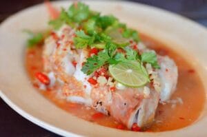 ปลาสดนึ่งราดน้ำมะนาวและกระเทียม อุดมไปด้วยโปรตีนและไขมันดี